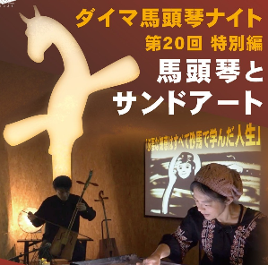 今回はダイマ馬頭琴ナイト第20回特別編として、サンドアートと朗読の嵯峨孝子さんをゲストにお迎えしたライブパフォーマンスショー「必要な知恵はすべて砂馬で学んだ人生」をお届けします。
