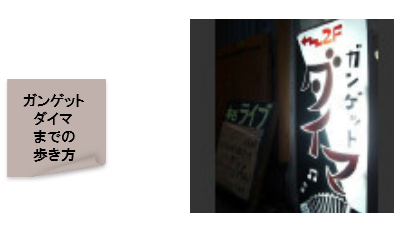 狸小路1丁目の東の出口から信号で創成川広場を超えて東に渡ると、細い路地の入口があります。路地をまっすぐ進んでいただくと、中ほど(bar switchさん横)に「ダイマ」のあんどんと外階段があります。階段を上がるとガンゲット・ダイマです。